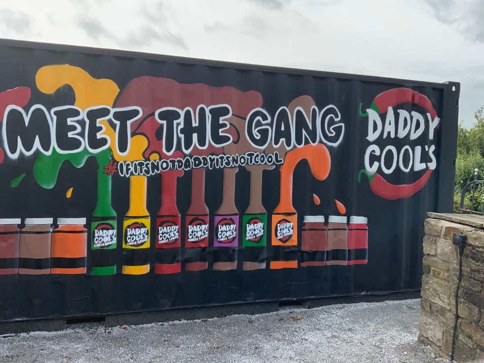 daddy cools chilli sauce painted onto a container near the entrance of woodhead, UK